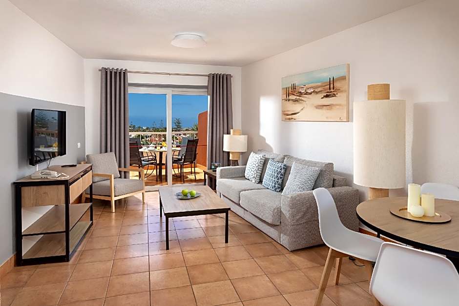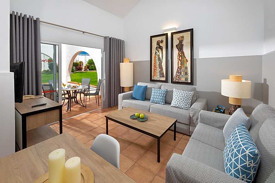 This air-conditioned apartment has a large terrace with a lounge set, automatic sun screen, sun loungers and views of the pool and garden. It includes a twin bedroom with TV, a bathroom with a hairdryer and toiletries and a lounge with a TV. The kitchen comes with a ceramic hob, microwave and fridge. A range of extra facilities includes: wine and fruit on arrival, free safe, complimentary mini-bar on arrival, coffee machine with free capsules, one a-la-càrte dinner including house wine for stays of minimum 7 nights, electric kettle with infusions, pool towels in the room, complimentary slippers and beach bag, bathrobes and special bathroom amenities.